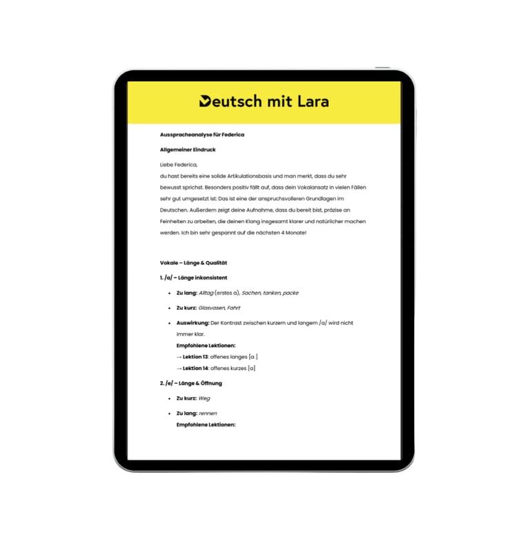„In meiner erste Live-Sitzung mit Lara habe ich innerhalb weniger Sekunden mein jahrelanges Ausspracheproblem mit den Wörtern „Beet“ und „Bett“ gelöst. Jetzt bin ich sehr froh und unglaublich glücklich, dass ich den Aussprachekurs „Deutsch mit Lara“ entdeckt habe. Jeden Tag arbeite ich gezielt an meinem Akzent – und sehe echte Fortschritte.“