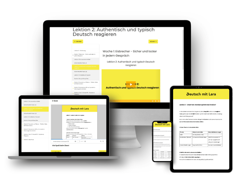 Alle Inhalte des Kurses als durchsuchbares E-Book. Perfekt zum Nachschlagen und Wiederholen. Du hast den gesamten Wortschatz immer griffbereit, auch offline.